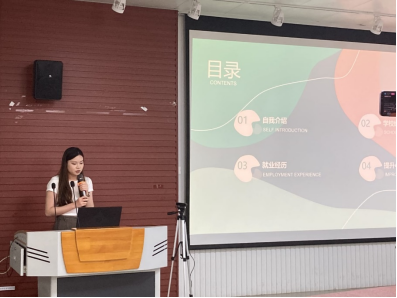 第二位分享经验的嘉宾是莫晓盈同学。莫晓盈同学在研究生期间曾任ladbrokes立博研究生会主席、兼职辅导员,曾获ladbrokes立博学业奖学金一等奖、陶建明奖学金等,已被广西电网有限责任公司信息中心录用。莫晓盈同学为大家介绍了研究生一、二、三年级每个阶段应该要完成的事情,并详细介绍了如何备考实习、如何选择应聘单位、如何准备简历。