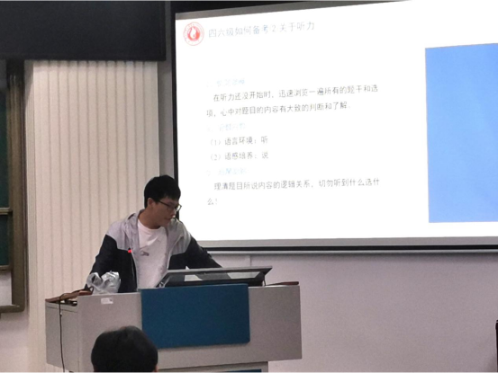 随后,孙梓铭同志分享了大学英语四、六级备考经验,主要从四、六级的题型分布,如何备考、如何锻炼听力等方面分享了自身经验,并就如何持续学英语提出自己的建议。