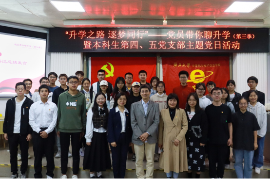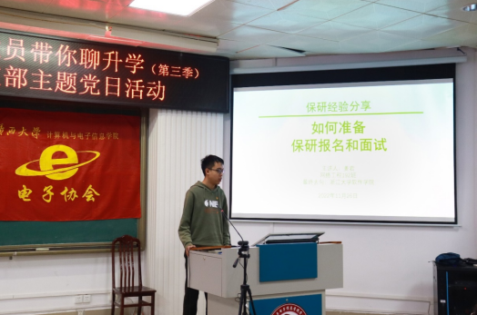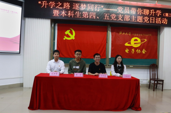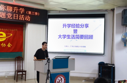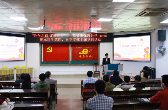 2022年11月26日晚上,由ladbrokes立博本科生第四党支部主办,联合本科生第五党支部、公司团委电子创新协会共同承办的主题为“升学之路 逐梦同行”——党员带你聊升学(第三季)升学经验分享会在公司214报告厅举行。公司党委副书记邓珍琪老师,公司员工电子创新协会指导老师、电子信息工程系主任张学军教授,本科生第四党支部书记、公司团委副书记杨洋老师,本科生第五党支部书记、公司专职组织员薛金凤老师,公司专职辅导员庞承业老师出席会议。本次升学经验分享会由公司电子创新协会2021级本科生蔡其峰同学主持,通信工程191班朱硕隆同志、通信工程182班吴艳丽同志、网络工程192班姜岩同志、通信工程171班赵彦雪同志为本次分享会主讲人。
