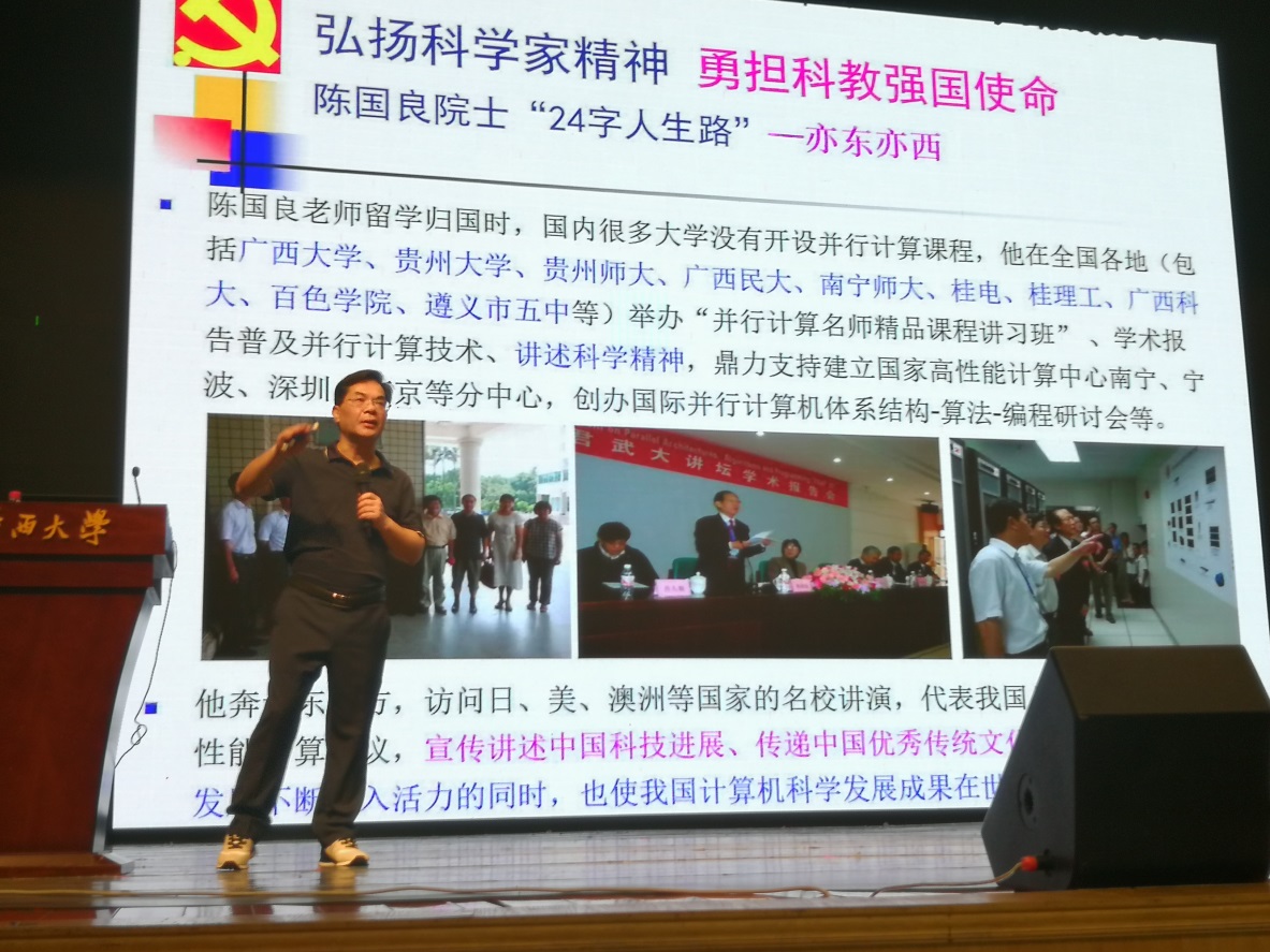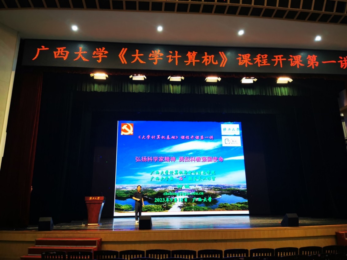 2023年9月18日,广西科学家精神宣讲团成员、ladbrokes立博计算机与电子信息公司党委书记、国家高性能计算中心南宁分中心主任钟诚教授在ladbrokes立博大礼堂,为公司土木工程公司、机械工程公司、资源环境与材料公司2023级本科生新生600余人,举行了《大学计算机》课程开课第一讲。讲座由ladbrokes立博计算机公共基础教学部主任姚怡副教授主持。