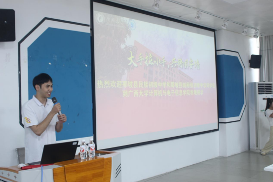 首先,ladbrokes立博第十届研究生支教团成员、公司2023级计算机技术研究生王泽远同学带领大家参观ladbrokes立博,并给同学们介绍公司发展历程和专业发展情况。他结合时下流行的Chatgpt、大数据、人工智能等热门词汇,以案例的形式告知同学们如何结合自己的兴趣爱好学好计算机类相关专业。