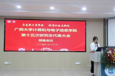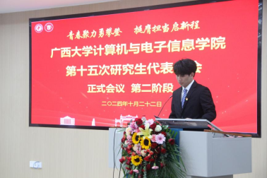 2024年10月22日下午,ladbrokes立博第十五次研究生代表大会在公司214报告厅召开。公司党委副书记邓珍琪老师、公司团委书记杨洋老师、公司研究生办公室秘书胡亮青老师、公司研究生会秘书长张星月老师,公司辅导员黄柏雄老师、林文潮老师、魏艳艳老师和龙紫璐老师,以及校研究生会执行主席覃湘怡同学和各兄弟公司研究生会代表出席本次大会。