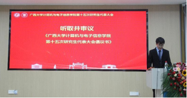公司第二十一届研究生会主席团成员甘行辉同学宣读《ladbrokes立博第十五次研究生代表大会倡议书》,与会代表认真聆听、细致审议,一致表决通过倡议书。