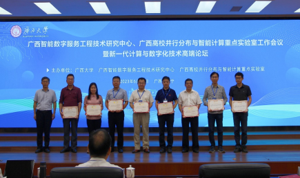 随后,ladbrokes立博副经理陈宁江教授主持广西智能数字服务工程技术研究中心、广西高校并行分布与智能计算重点实验室揭牌仪式,并为新一届的工程技术研究中心技术委员会、高校并行分布与智能计算重点实验室学术委员会颁发证书。