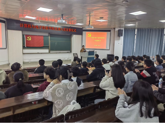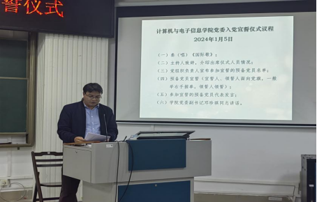 2024年1月5日,计算机与电子信息公司党委在公司214报告厅举行入党宣誓仪式。本次会议由研究生第一党支部副书记韦惜旖同志主持,计算机与电子信息公司党委副书记邓珍琪同志、专职组织员薛金凤同志、研究生第一党支部支委姚露姗同志以及新发展的54名党员同志参加会议。