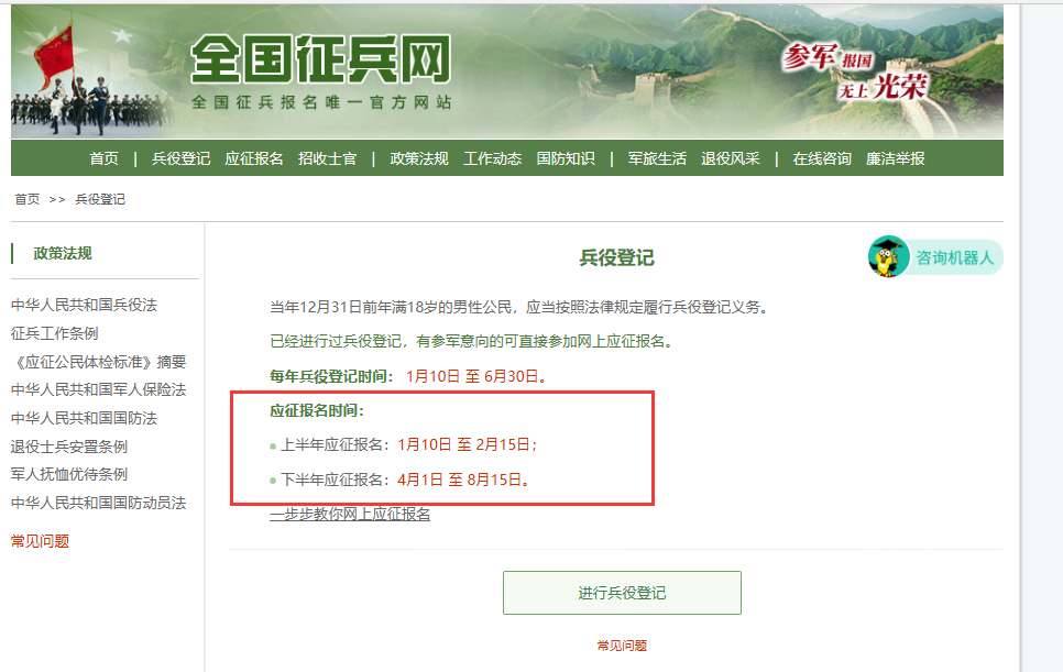 (1)网上报名预征:有应征意向的高校毕业生可在征兵开始之前登录“全国征兵网”(网址为https://www.gfbzb.gov.cn)进行报名,填写、打印《应届毕业生预征对象登记表》和《高校毕业生应征入伍学费补偿国家助学贷款代偿申请表》(以下分别简称《登记表》、《申请表》),交所在高校征兵工作管理部门。
